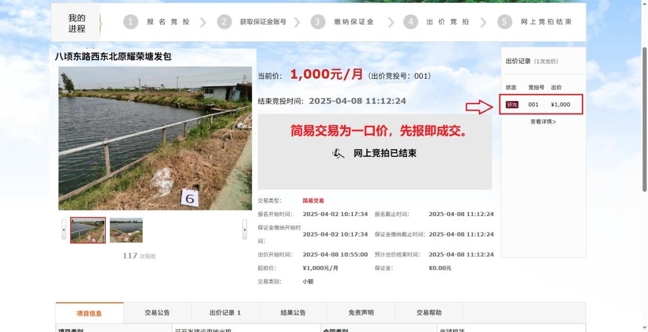 5、当时间到了竞投截止时候后,竞投自动结束,结束后当前价即为最高竞得价,同时在出价记录中会显示全部出价的情况。